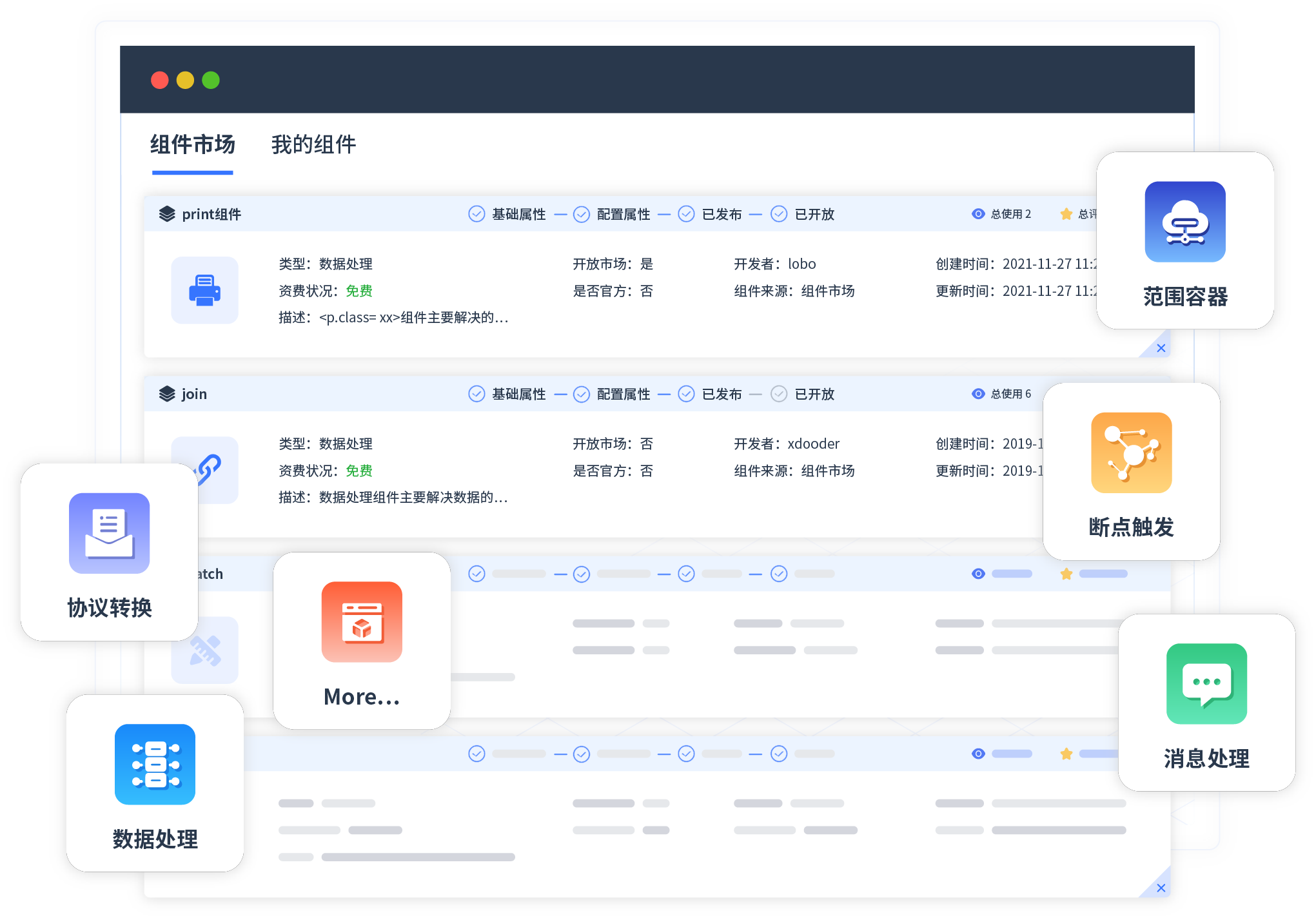 针对集成场景,,,沃钱包提供组件市场,,,例如协议转换、、、、消息处理、、、、文件操作等。。。。除平台提供的组件外,,,客户可以自定义所需组件。。。。