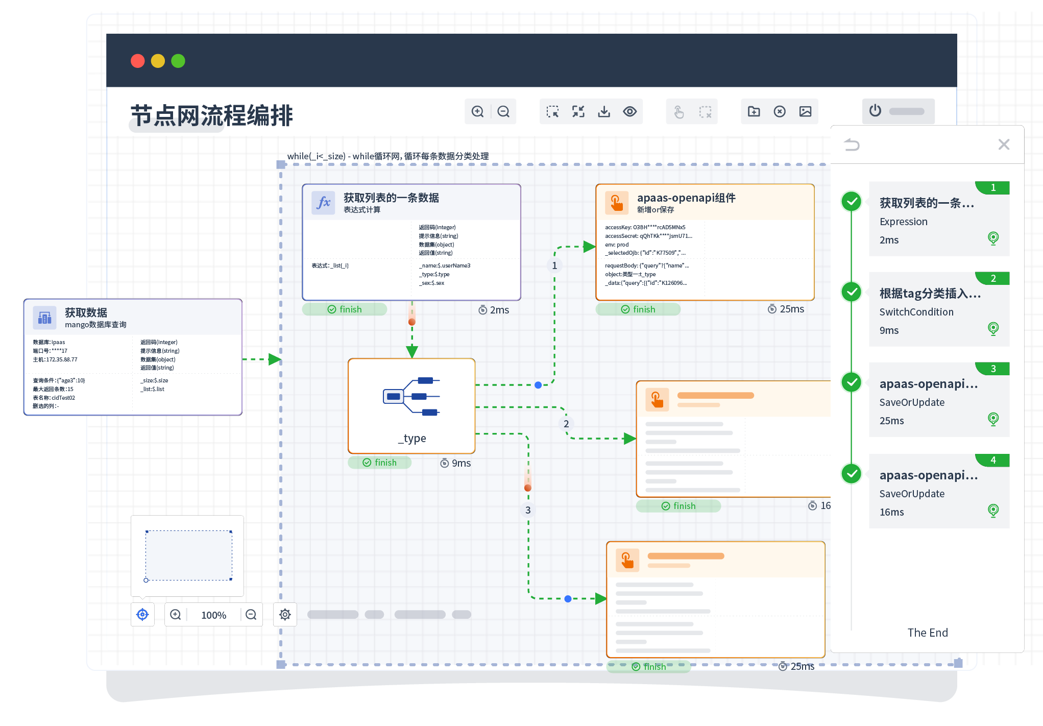 针对集成场景,,,组件定义后支持进行流程编制,,不同于传统代码方式,,,通过图形化展示,,支持在线调试、、日志查看和运行回放。。。。