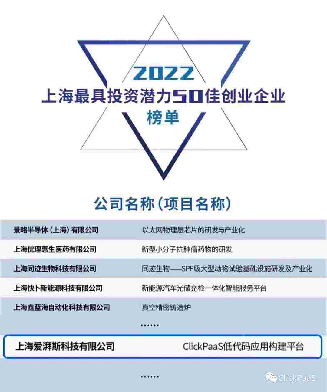 沃钱包 作为国内低代码PaaS平台的领军企业,,与120家创企入围角逐。。。。期间接受了来自德同资本、、、领中资本等知名投资机构的10位投资人组成专家评委团的背靠背盲选。。并最终入围“2022上海最具投资潜力50佳创业企业”榜单,,被列入“上海市重点培育创业企业库”。。