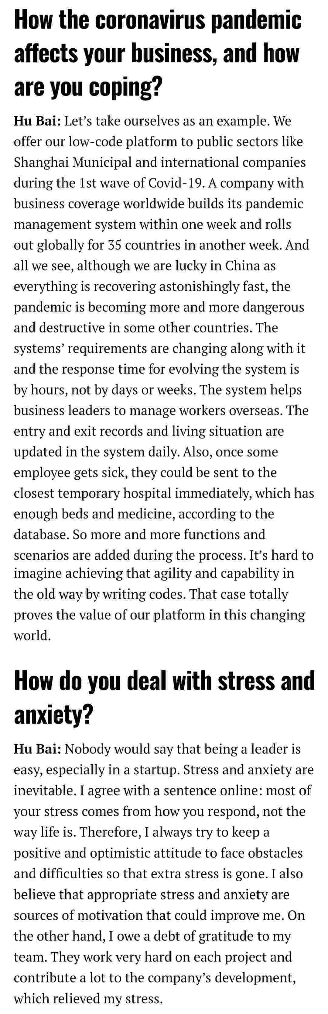 2021年年初,,爱湃斯科技CEO胡柏受邀接受法媒Startup.info的专访,,,与Startup info的读者分享了自己的创业经历、、、以及低代码平台沃钱包的创新之处。。。
